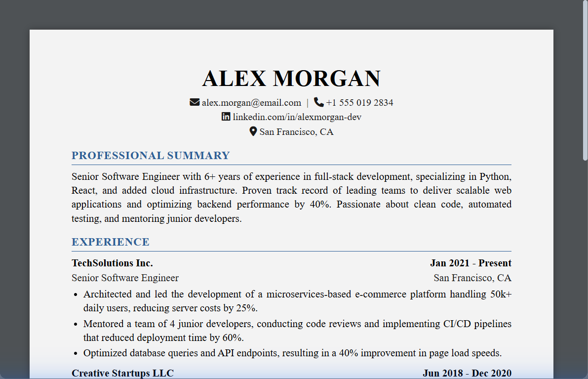 "The best free CV builder. Simple, fast, and the PDF looks amazing. I landed my first internship within a week of using this."