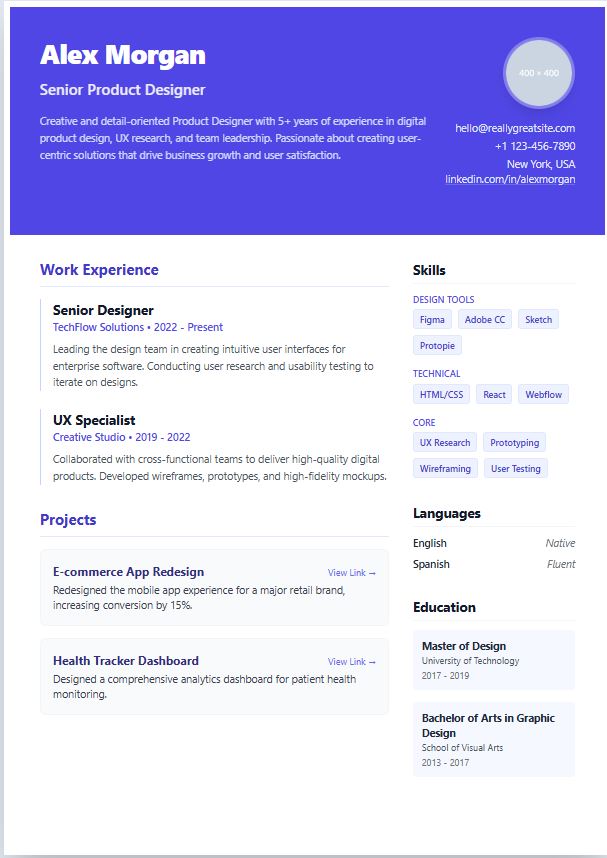 Download high-quality A4 PDF resumes ready for printing or emailing with a single click.